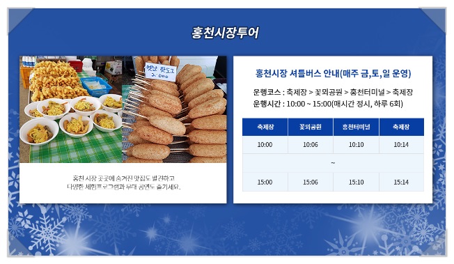 송어 축제답게 얼음 낚시터, 맨손 송어 잡기, 야간 낚시터, 비발디 파크의 스노 월드, 스릴만점 눈썰매, 홍천 시장 투어, 시골 초가집 풍경 재현, 당나귀 타기 체험, 향토 음식점, 선등거리, 얼음 눈꽃 분수 등 추운 겨울이지만 액티비티 한 활동을 하며 즐길 수 있도록 즐길거리, 볼거리, 홍천 시장에서의 먹거리까지 가격적으로도 부담 없이 마음껏 즐길 수 있습니다.