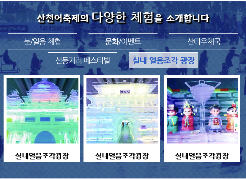 - 세계 최대 실내 얼음 조각 광장 : 오전 9시~오후 9시까지 (화천읍 하리 서화산 다목정 광장 내)