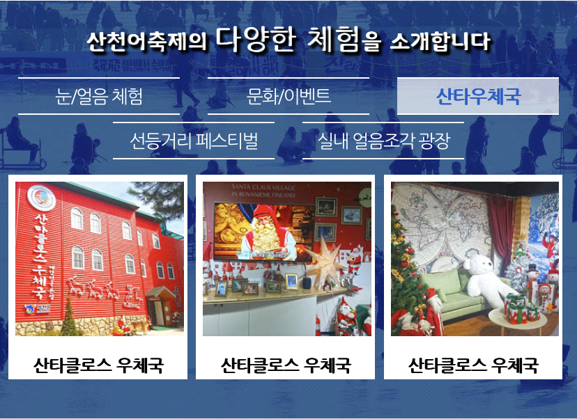 - 산타 클로스 우체국 대한민국 본점 : 산타 할아버지에게 편지를 보내면 핀란드 산타마을에서 답장이 오는 곳